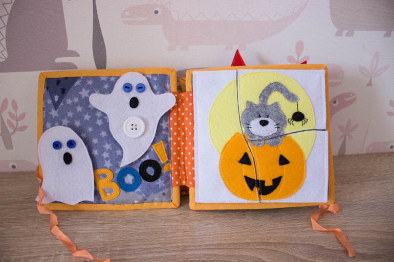На первом развороте пазл с тыквой и кошкой и веселые привидения, которые можно снять и поиграть как отдельными игрушками. Одно привидение на липучке, другое на пуговице.