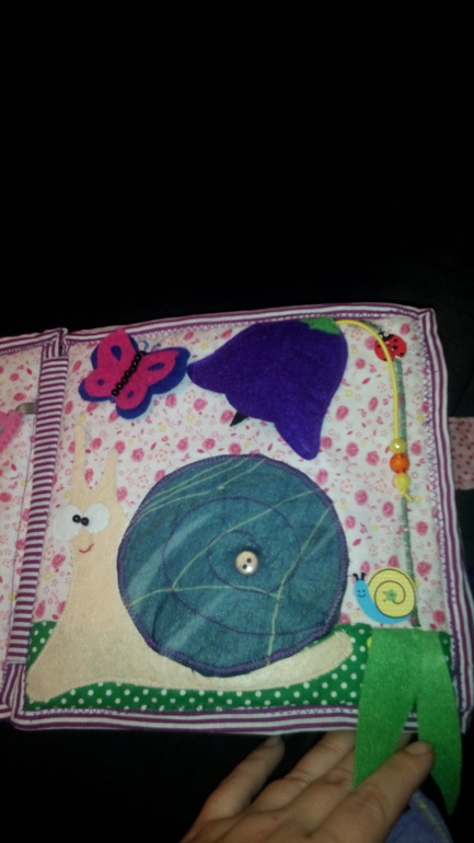 На третьей странице улитка с лабиринтом, по которой можно пальчиком катать пуговичку. За листиком прячется маленькая улитка-пуговка(учим большой-маленький). В цветочке пчелка на перетяжке. Шуршит.