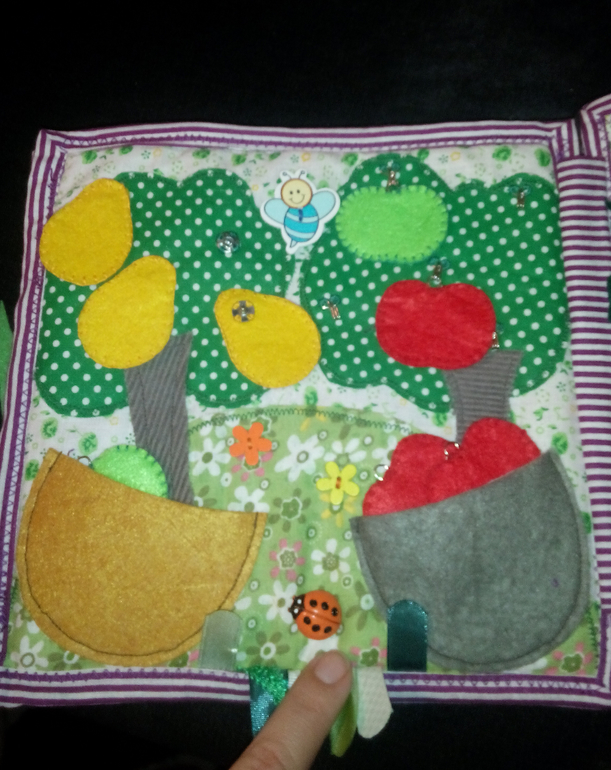На следующем развороте сад с грушами на кнопках и яблочками двух цветов на крючках. Изучаем цвета, счет, застежки.