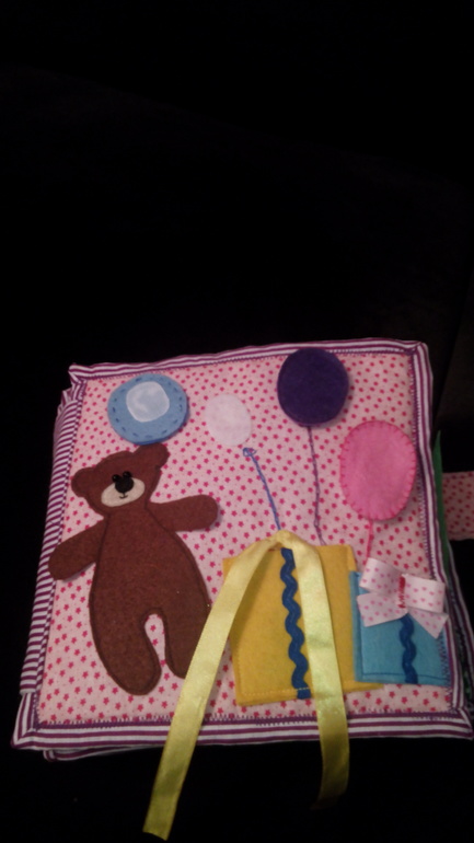 Итак, книжка состоит из 4 листов, 6 страниц игровых и 2 странички - обложка( тоже с заданиями). Книга выполнена из хлопка и фетра. Наполнитель- поролон. На 1 странице-обложке мишка ( с ним можно здороваться), шарики на липучках подбирать по цветам ниточек. Большой и маленький подарочек, на большом учимся завязывать бант.