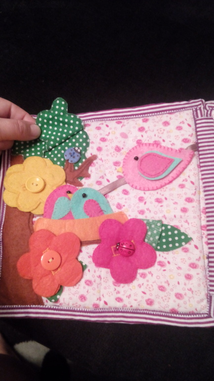 Вторая страница- птенцы и мама- птичка, которая двигается по тесемке. Цветочки на пуговицах по цветам, снимаются (учимся застегивать пуговицы).