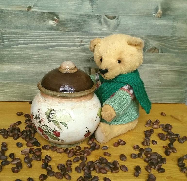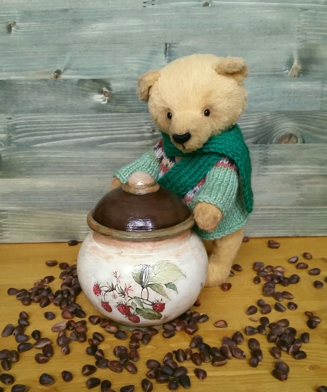 Сшит вручную из немецкой вискозы, набит дубовыми опилочками, утяжелен металлическим гранулятом. Семочка сладкоежка, у него всегда в запасе горшочек сладенького)) Рост малыша 20 см.