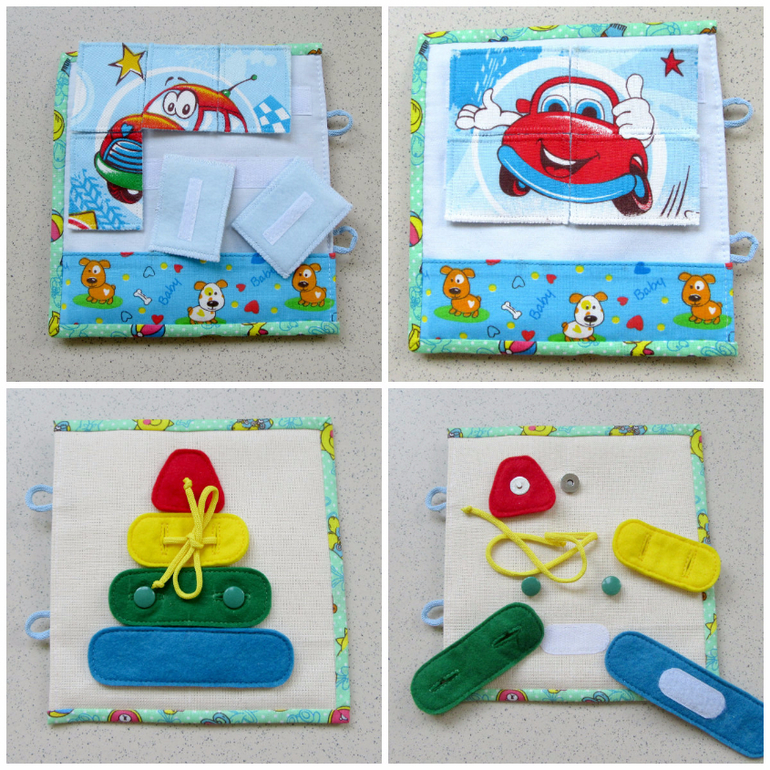 Разворот, который я назвала логическим - собираем два пазла из 4 и 6 деталей, с пирамидкой изучаем основные цвета и различные виды застежек (липучка, пуговки, шнурочек, магнитная кнопка)