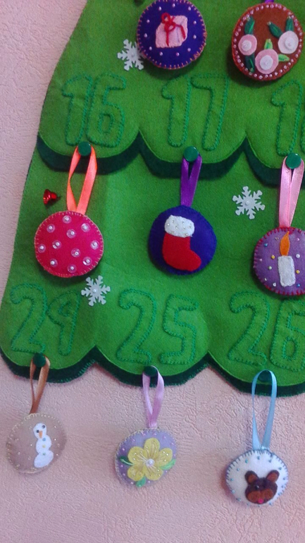 ФетрСотворила Ёлку 80 см.Полностью из фетра.Сначала задумывалась как адвент,но потом не придумала куда кармашки пришить.Получилась просто ёлка -календарь.Более 5 фото.