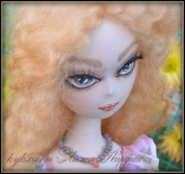 Ростом кукла 62 см, с подставкой 64. Тело костюмная ткань, набита синтепухом, плечевые и бедренные суставы на шплинтовых шарнирах, голова на ниточном креплении, поворачивается куда захочется, колени и локти на ушкообразном креплении, сгибаются, кисти рук - полимерная глина, ручная лепка, лицо расписано акриловыми красками, волосы -овечья шерсть, которую я сама красила с помощью луковой шелухи, изначальный ее цвет слегка молочный.