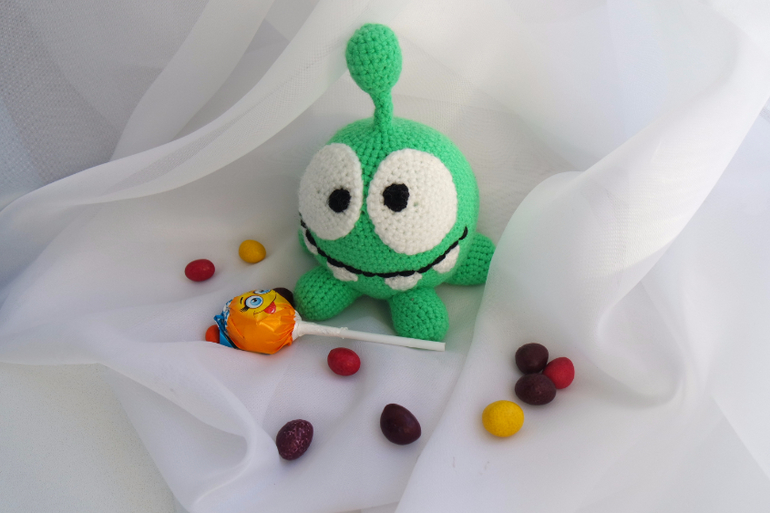 Амигуруми (вязаные игрушки)Моя маленькая дочь просто обожает этого сладкоежку Няма, как она его зовет))) Вот решила порадовать доченьку. Развеселил он всех! еще 2 фото под катом