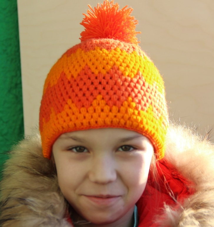 Связала дочери яркую шапочку. Смотрится отлично, даже не ожидала, что так здорово получится. Вяжу теперь такой же снуд, в комплекте, думаю, будет еще лучше).