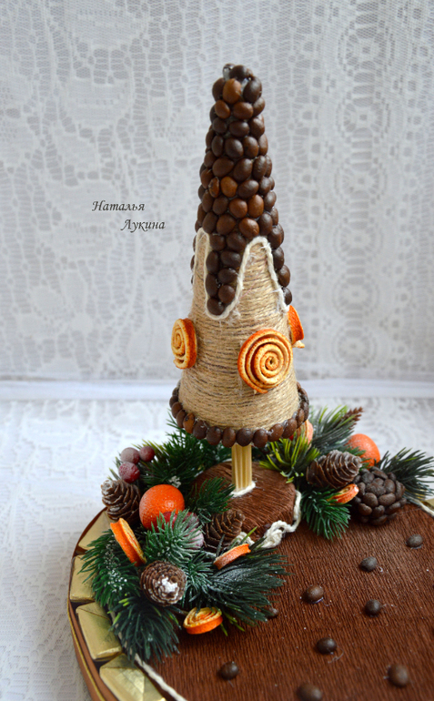 Елочка ручной работы из кофейных зерен, конфеты Птичье молоко.