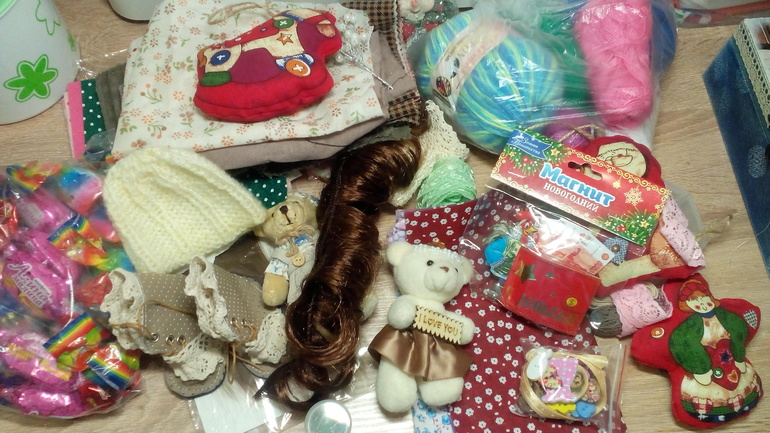 Исправляюсь)) менялись мои куколки на товары для рукоделия. Сколько всего я получила! И трессы, и ткани, и кружева, мишки для кукол и много всего прочего. И конечно же, конфетки! Спасибо большое, Марина, за чудесный обмен