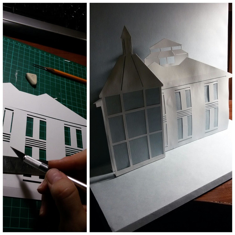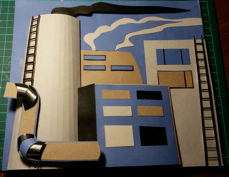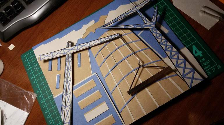 Вот это франтальная композиция из дизайнерской бумаги: промышленная зона, архитектурная и строительная, все вырезается скальпелем и наклеивается.