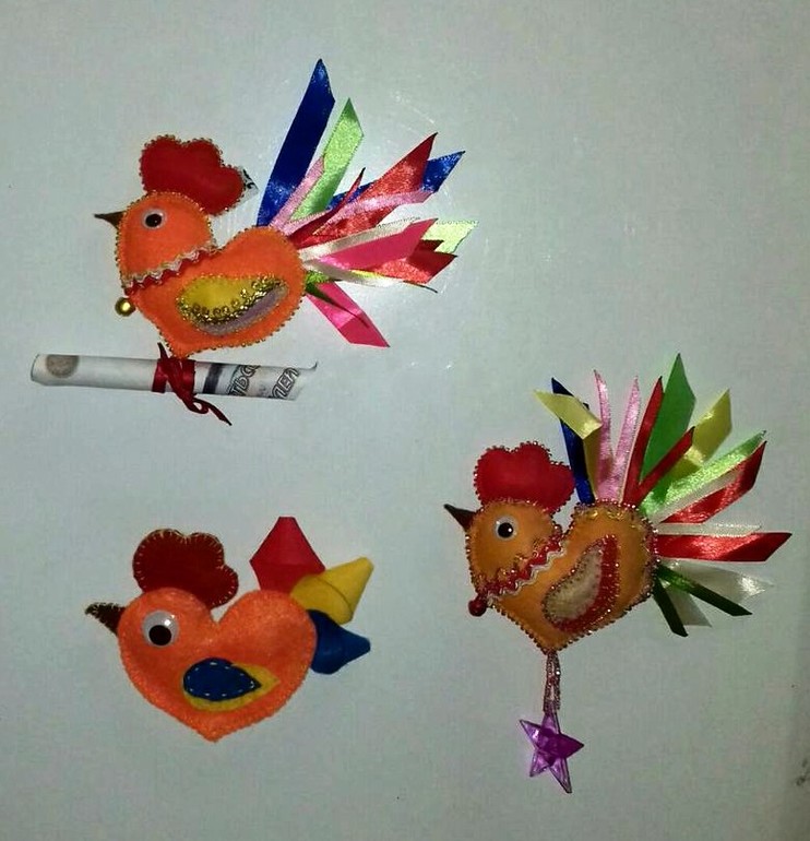 А я хочу показать вам свой символ года, петушков - магниты на холодильник.