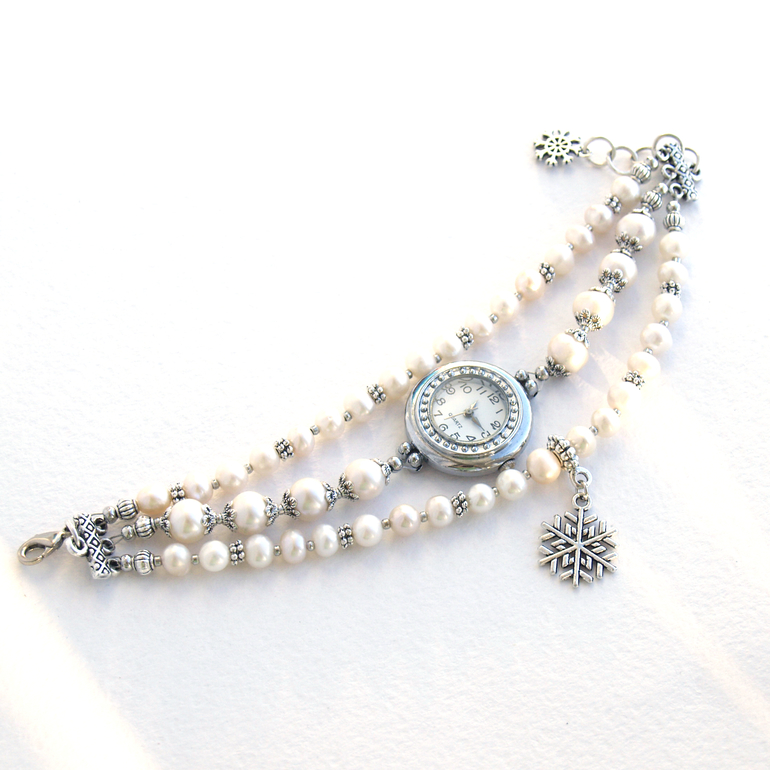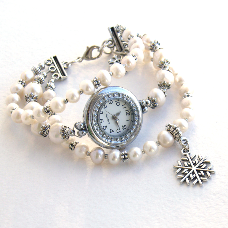 Жемчуг можно носить в любое время года! А если добавлены еще и тематические элементы, то он смотрится еще лучше! Часики собраны из натурального жемчуга и украшены снежинкой.