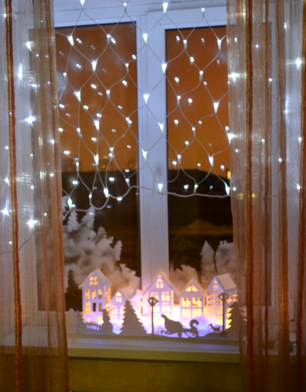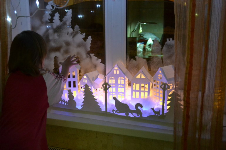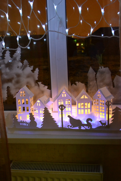 Так что, два листа ватмана - 50р, две гирлянды на батарейках из фикс прайса - 100р, один баллончик искусственного снега- 49 р, немного синтепона и клея, и готова зимняя сказка.