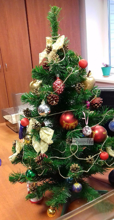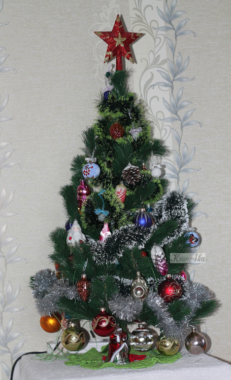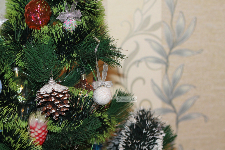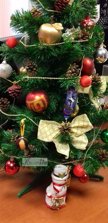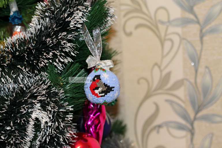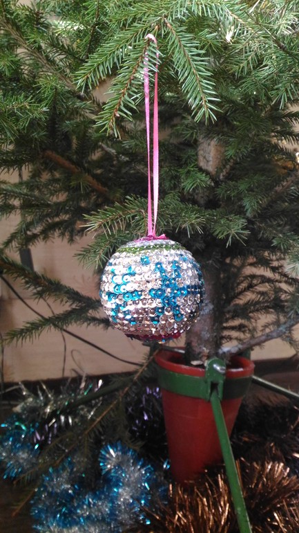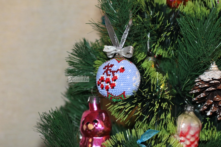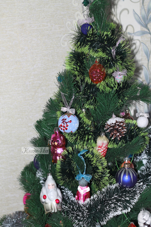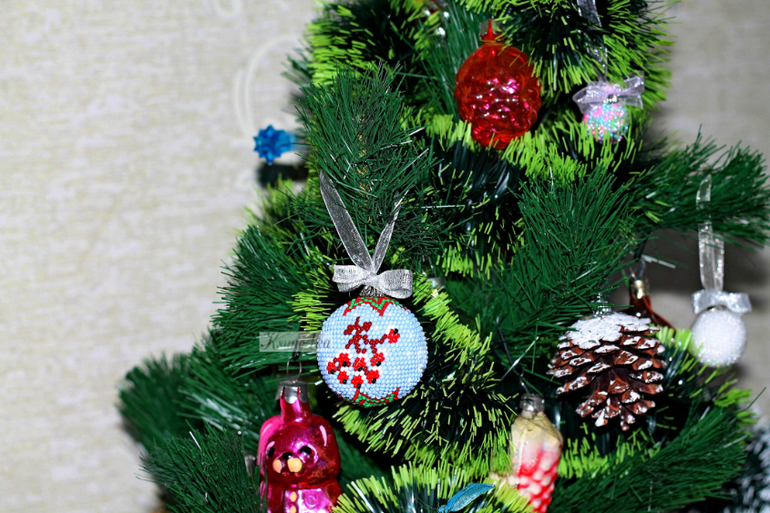 Некоторые фото делала прямо в момент дарения. Эту ёлочку украсили два моих маленьких шарика. Один из них - по схеме с цветами.
