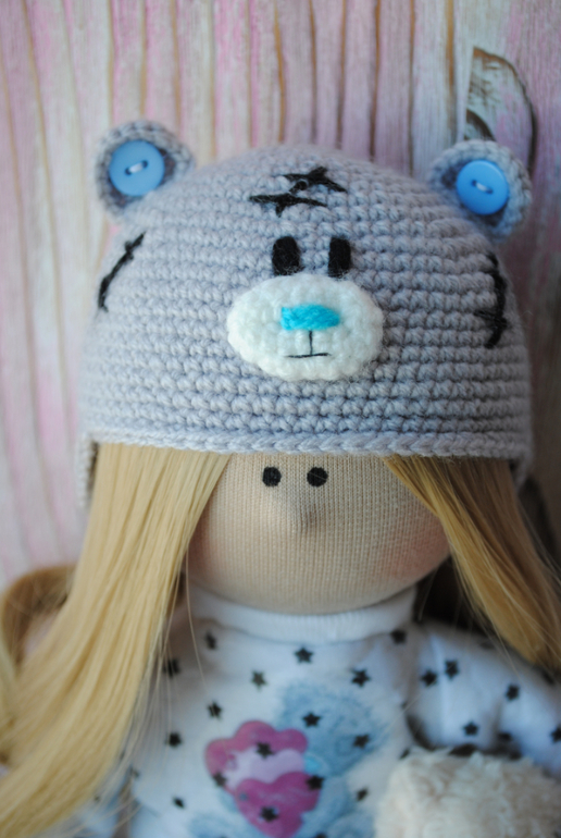 Кукольный мир - человекоподобные куклыЛюбительница мишек одета в теплый свитшот, джинсы и угги. Шапочка снимается. На уггах нашит настоящий лейбл. Малышка собралась на прогулку, поэтому у нее с собой рюкзачек из натуральной кожи ручной работы.Одежда не съмная. Под катом 5 фото