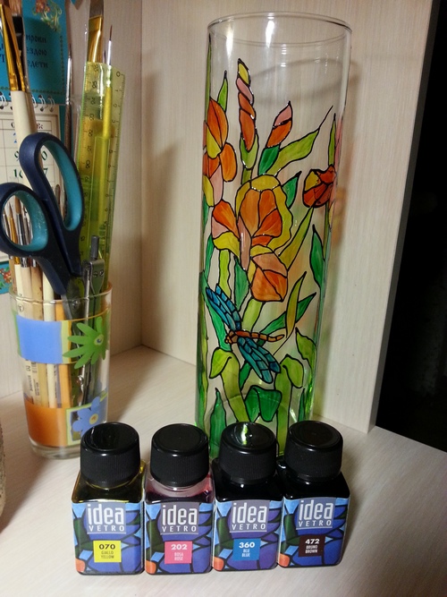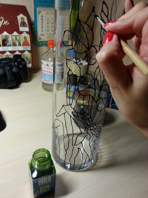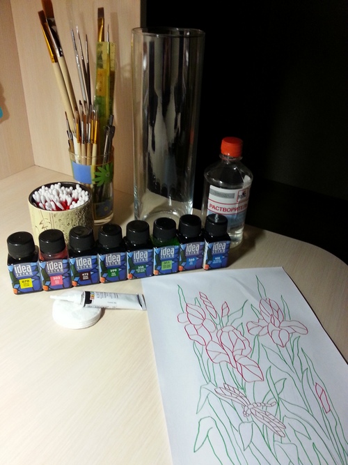 Для росписи вазы нам понадобятся.....кисти, краски на лаковой основе Идея, контур любой (я беру Декола), ватные палочки, ватные диски, растворитель, ну и сама ваза). Перед началом работы, вазу нужно обезжирить. Прекрасно подойдёт любое чистящее средство для стёкол