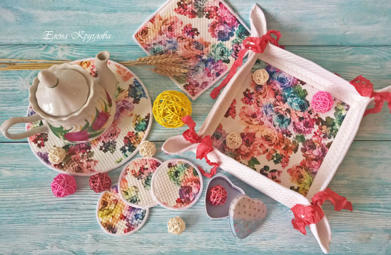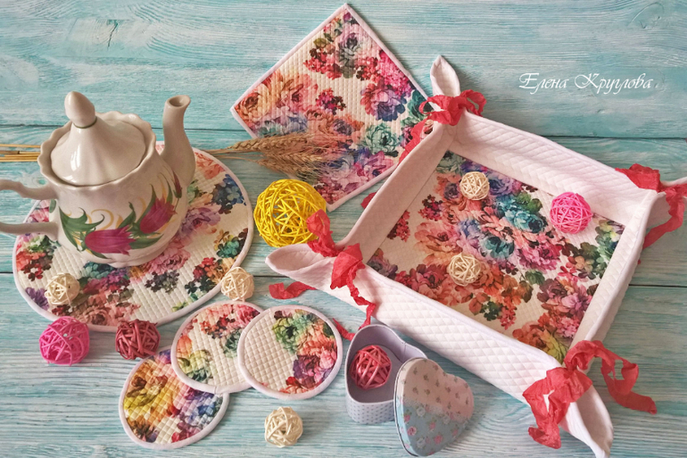 Шитье одежды, выкройки, ремонт одежды, шторы, швейные машины (уже приобретенные)А у меня уже во всю весеннее настроение,поэтому сегодня вот такой наборчик (корзиночка для конфет/печенья/хлеба/фруктов, прихватка, подставка под горячее, подставки для кружек). Набор сшит из трикотажа стежки.