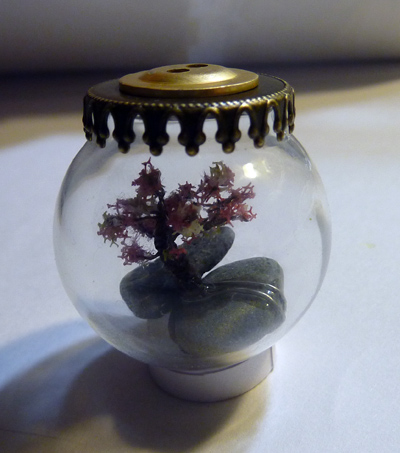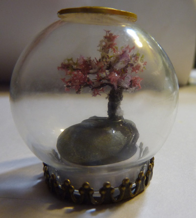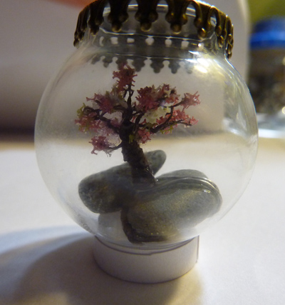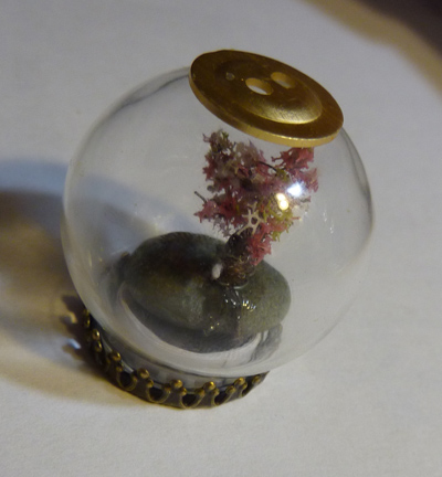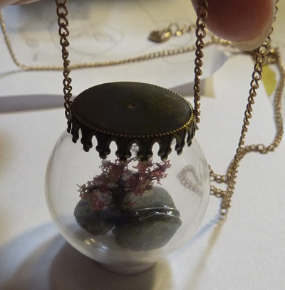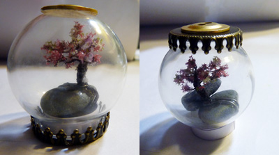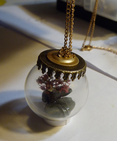 В "банке" вид на дерево в середине стекаляшки, без искажений, но вид сверху кулона невозможен - там крышка; в "шаре" вид сверху возможен, но из-за выпуклости сферы, появляются некоторые оптические искажения.
