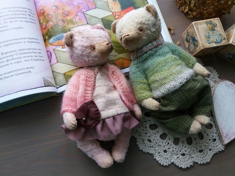 Тедди: мишки и их друзья.Сегодня готова представить вам паручку тедди мишек.Знакомьтесь Рита и Сёма.Ростиком 21см.Сшиты из крашенной вручную вискозы.Внутри опилки и металлический гранулят.Рита одета в платьице и кофточку,Сёма в свитерок и брючки.Вот такая милая парочка получилась.