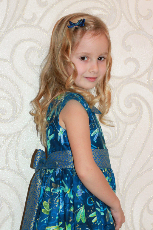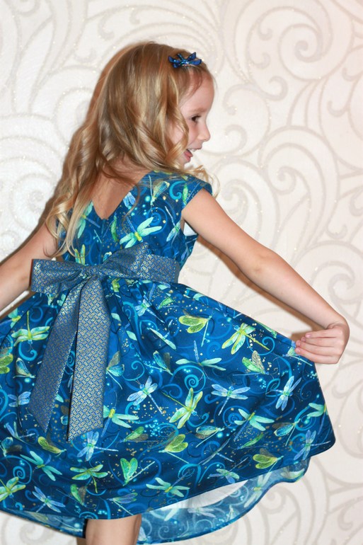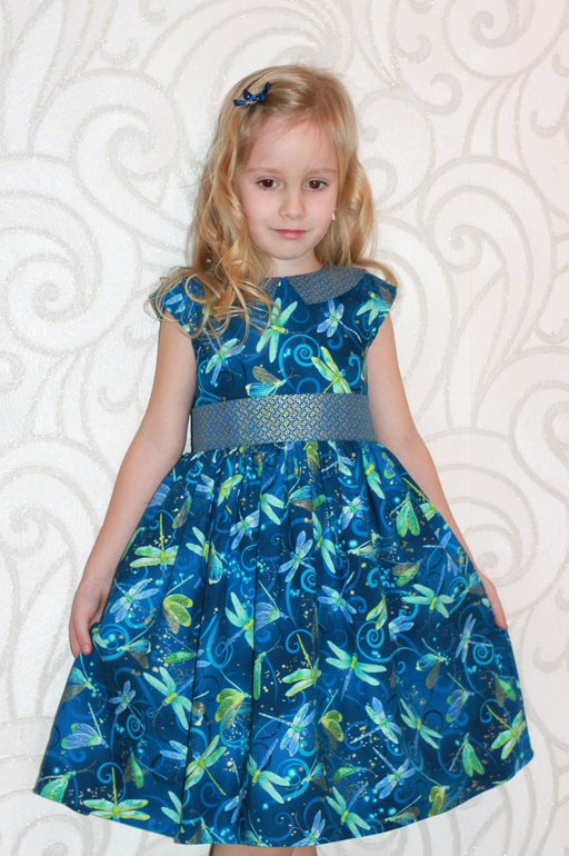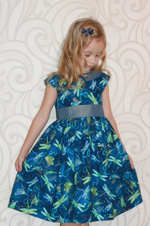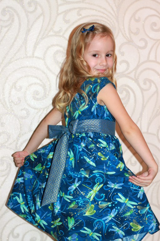 Обычно посылки с американским хлопком приводят меня в неописуемый восторг, реальность превосходит все ожидания, но бывают и исключения. Когда я увидела этих стрекозок, то первая мысль была - "бабушкина", причем есть такая ткань, как из бабушкиного сундука, из нее получаются довольно милые вещицы, а эта мне тогда увиделась именно в платье для бабушки. На картинке она мне казалась волшебной! А ведь она с глиттером золотистым, моего любимого синего цвета, с любимыми стрекозами, но даже это ее не спасало в моих глазах, что-то не нравилось и все... Но потом я нашла у себя отрез синего хлопка с золотым рисунком, приложила к стрекозам и они заиграли новыми, яркими красками! Теперь оно мне нравится очень! Теперь оно волшебное!
