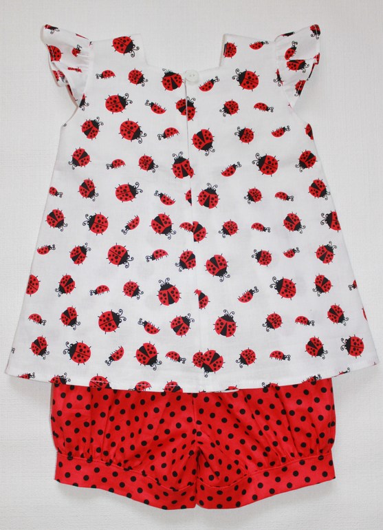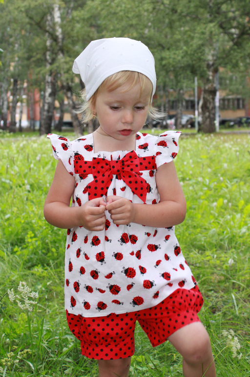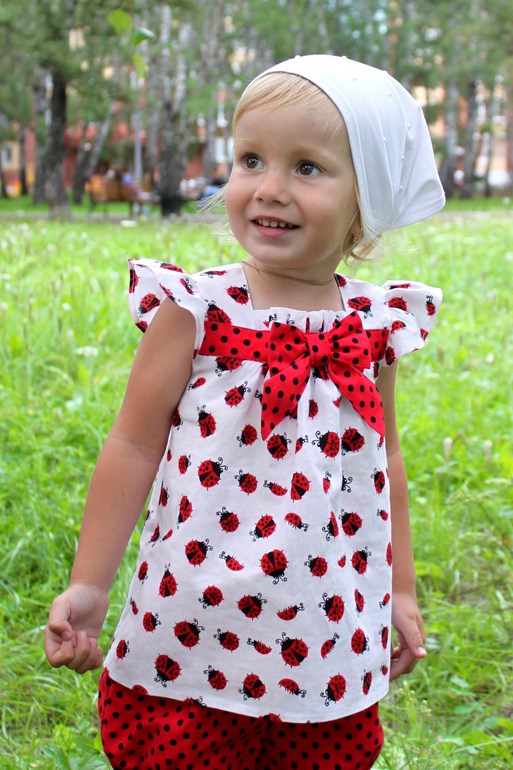 Комплект - шорты, туника и бантики. Шорты по одной выкройке, уже много раз упоминала, в этом комплекте шорты с карманами. Туника - полная импровизация, за основу взяла верхнюю часть платья-трапеции.