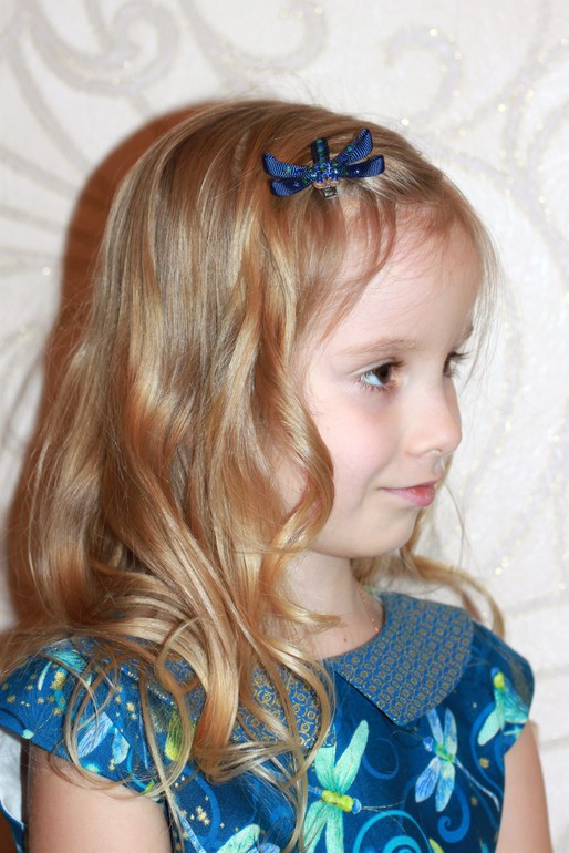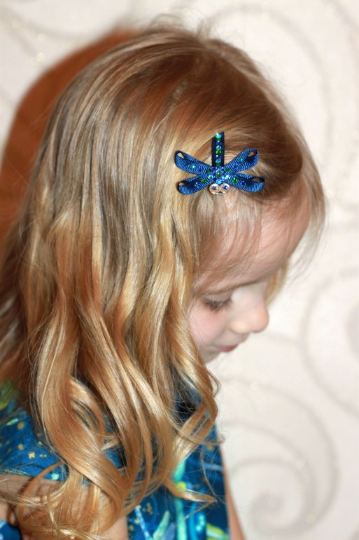 К обновке нам с Полинкой захотелось обязательно заколку-стрекозку, в магазинах ничего не нашла, тогда мы по-быстрому смастерили сами, из репсовой ленты и страз, дочка мне всегда помогает и делом, и советом.