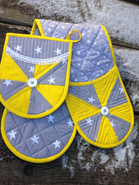Прихватки- для противня двойная и ещё одна. Я это сочетание желтого и серого назвала "Солнечный Петербург")