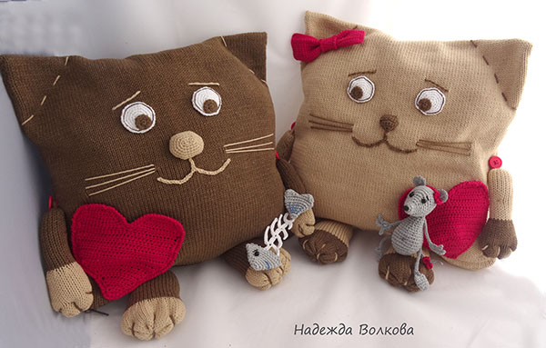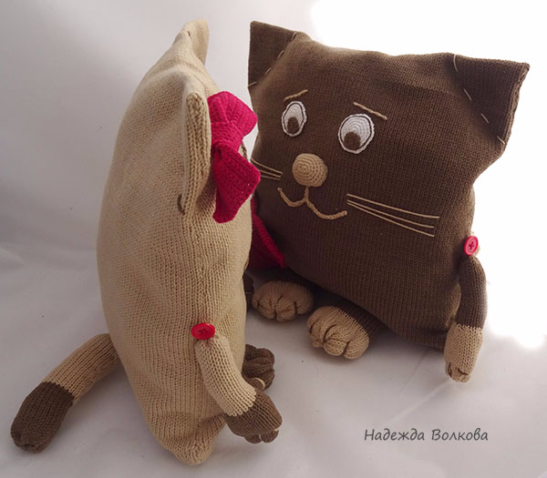 Машинная вязка (РАБОТЫ И СХЕМЫ)У меня снова связались милые подушки кошки. Размер 35*35 см. Чехлы на молнии для удобства стирки, конечности на пуговках съемные. Пряжа полухлопок. Основа машинная вязка, отделка и допы крючком.