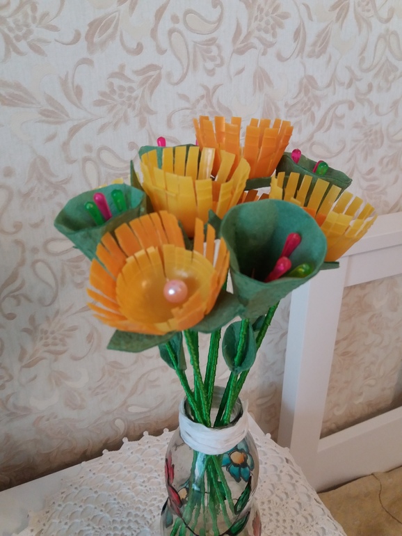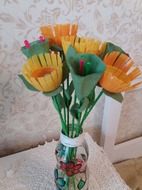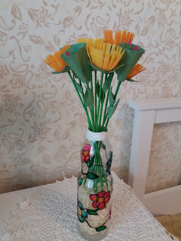 Поделки с детками.В саду попросили сделать поделку на тему-Вторая жизнь вещей.Сотворилась такая вот ваза с цветами.Ваза-это бутылка из-под сока,рисунок нанесла с помощью красок для витража.Цветы сделаны из яиц от киндера,стебель-шпажка декорированная лентой.Другие цветы вырезаны из коробки от яиц,также на шпажке,декорированные лентой.Листья вырезанны из этой же коробки,тычинки-шпажки для канапе.