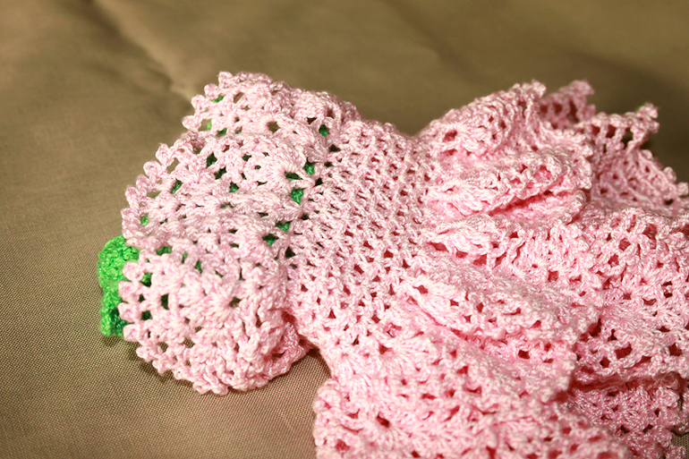 Розовым провязываем 1 ряд столбики без накида и затем вяжем по рисунку.