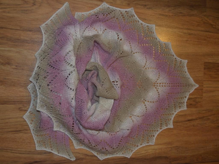 Вязание спицамиМоя шаль по мотивам шали Springtime Bandit, пряжа Кауни 8/2 пинк-беж, спицы 5, расход точно не знаю, пасму смотала 2 года назад, остаток 83 г)) Берет еще можно связать из остатков..