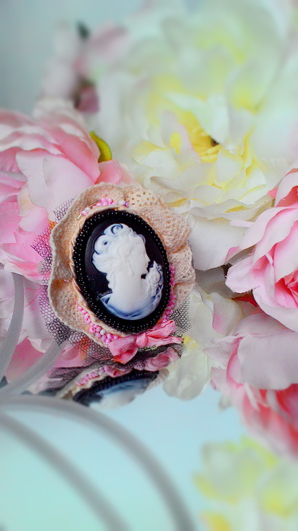 Бижутерия для слингомам. Слингобусы. Грызунки.Брошь-камея яркая, нежная, невесомая. В ней присутствуют хлопковые кружева, бисер, шелк и фатин.