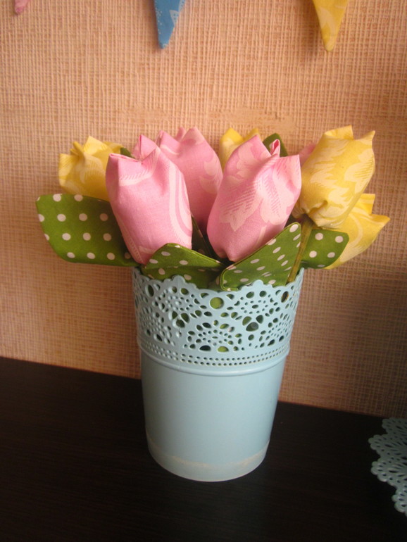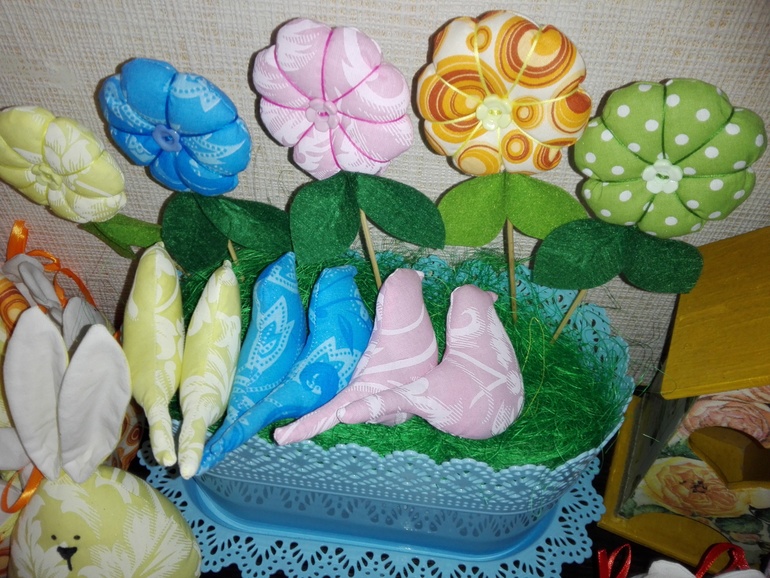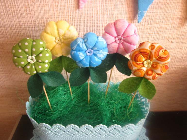цветочки на шпажках воткнуты в пенопласт, сверху пенопласт замаскировала зеленым сизалем