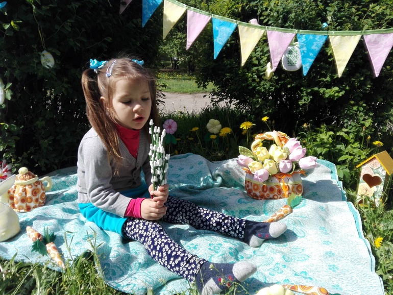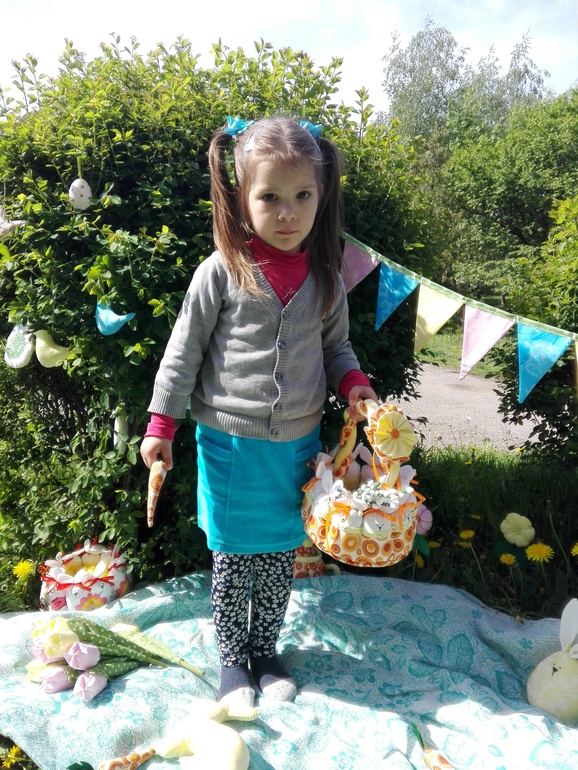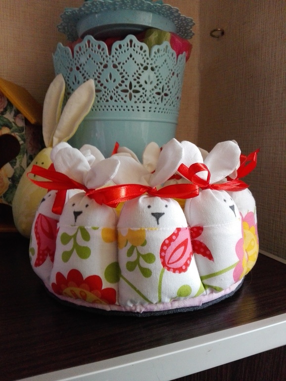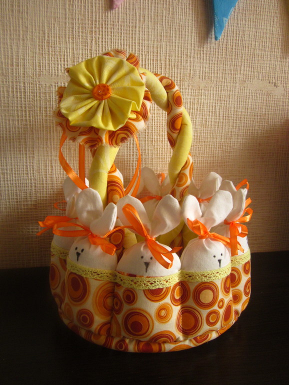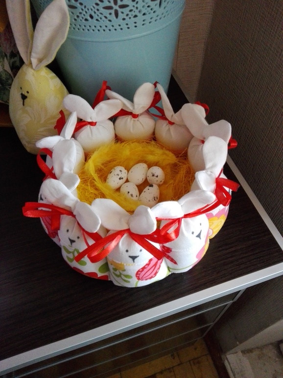 и еще одна корзинка с зайцами, только уже без ручки, сделали из нее гнездышко