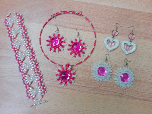 Порция бисерных украшений))))На этот раз в розовом цвете - комплект(колье и серьги), браслет и две пары сережек. Чешский бисер, бусины пластик и стекло, стразы пластик, металлическая фурнитура.