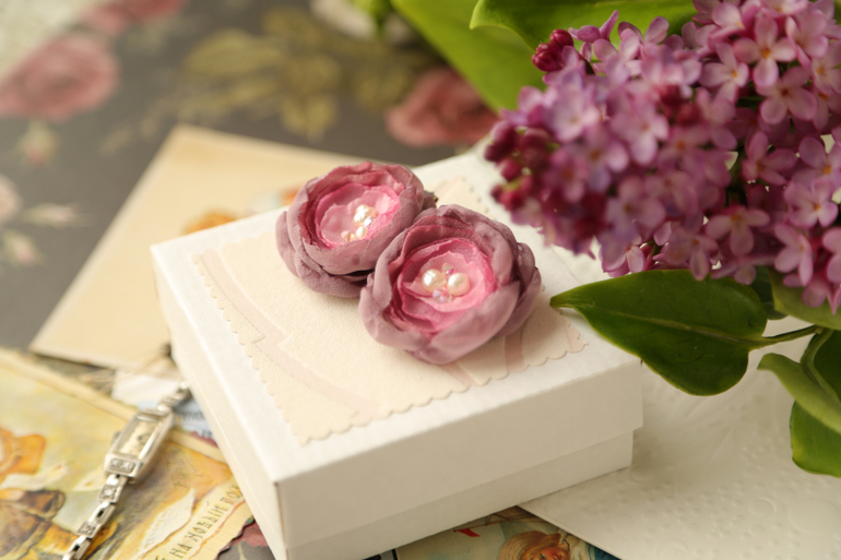 И парочка фиалко-роз из шифона с речным жемчугом и биконусами Swarovski