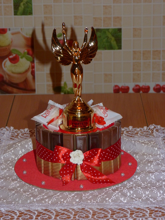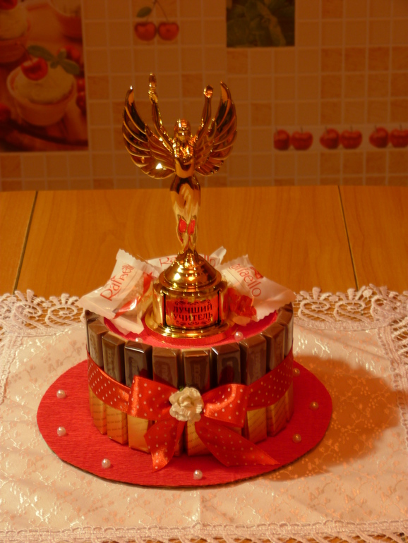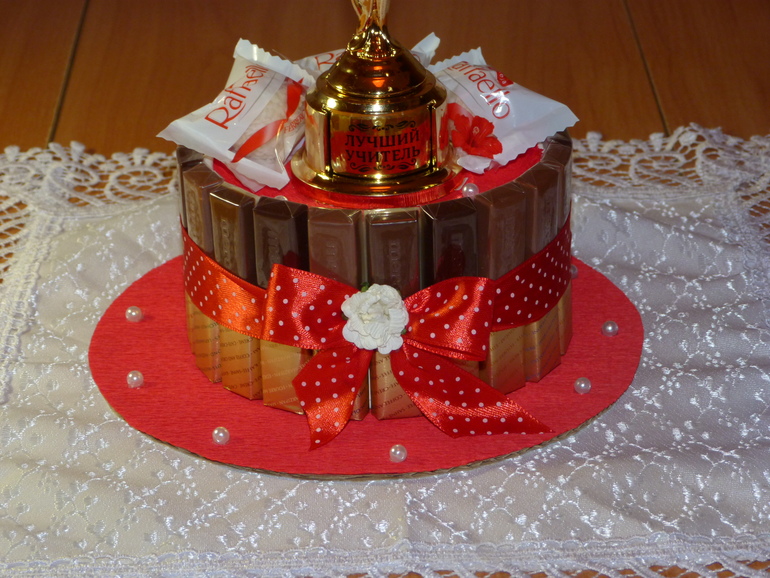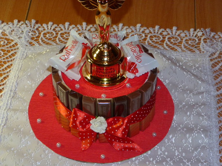 Букеты из конфет. Свитдизайн.Уже завтра у дочери последний звонок, вот и пролетели 4 года учёбы. Очень захотелось порадовать любимого учителя лично от себя, сотворился такой тортик. Основа - круглая коробка конфет "рафаэло", вокруг - шоколад "мерси", ну и декор. Под катом 4 фото.