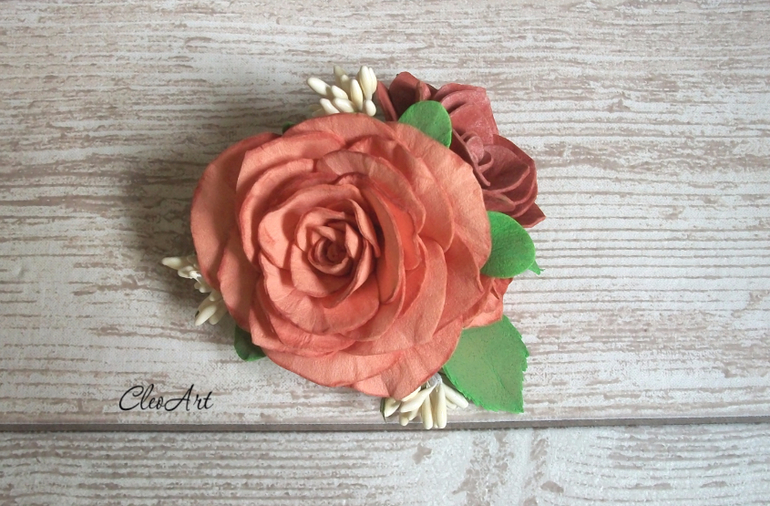 Цветы из ткани и форма. Канзаши. Украшения для волос.Нежная и выразительная композиция из роз терракотового оттенка украсит и оживит образ своей обладательницы. Брошь выполнена из фоамирана, практически невесома, но в тоже время очень практична, не деформируется и не боится влаги.