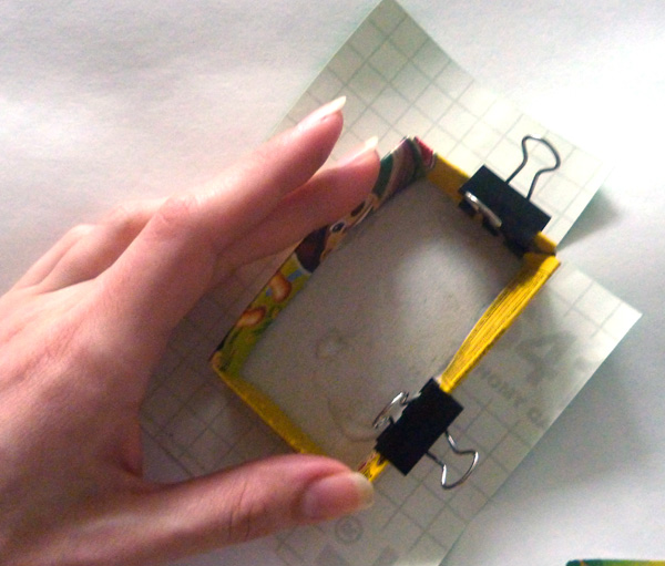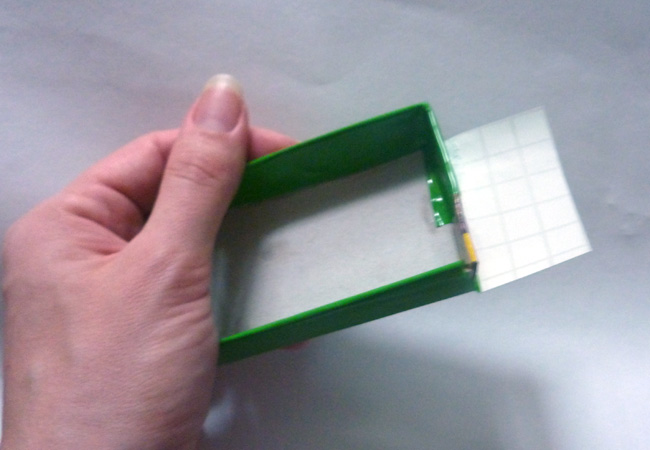 Пока клей сохнет (прижатый зажимами), примеряем самоклеющуюся пленку или бумагу, чтобы снаружи коробочка посимпатичнее была. Мой огород маскируется под «зеленую травку»: