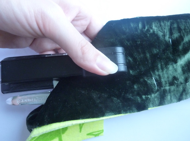 По нижним складкам (то есть по тем сгибам, которые окажутся на дне коробки, когда гармошку сложим и поместим внутрь) скалываем облицовку и наполнитель вместе степлером.