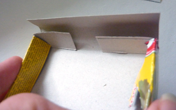 Поскольку я вырезала из коробки от печенья, там «ушки» вышли не целыми, но это не играет большой роли. Складываем картонку и склеиваем: