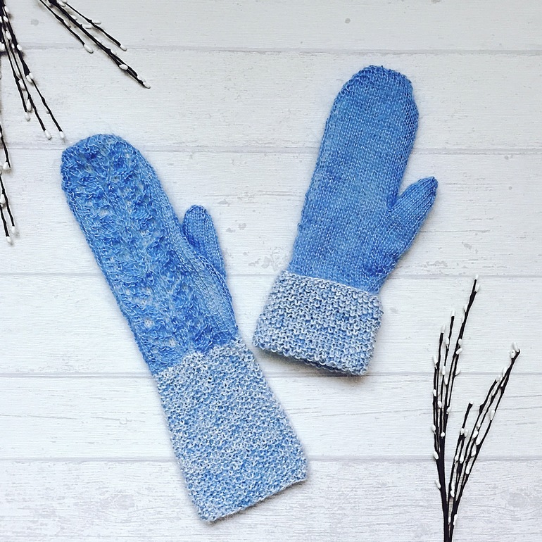 Варежки с удлиненным анатомическим манжетом, анатомический палец вывязан индийским клином. Связаны в две нити: основа - альпака с шёлком, ажурное полотно - ангорка.