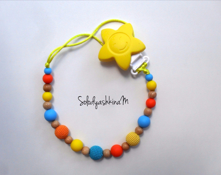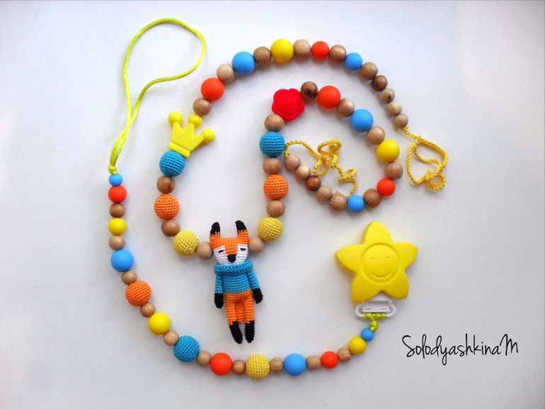 Комплект состоит из слингобус и держателя для соски\грызунка. Выполнен из Крымского можжевельника и пищевого силикона (предвосхищая вопросы - нет силикон не с алиэкспресса, закупается напрямую у крупных производителей имеет сертификаты тестовых испытаний на безопасность, из этого же силикона производители изготавливают пустышки, соски на бутылки и т.д.). Бусины обвязаны итальянским хлопком, ну собственно и игрушка из него связана.