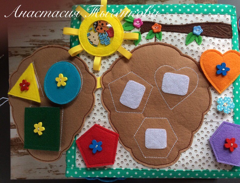 Это как книжечка небольшая. Сам улей закрыт на пуговицу, а внутри - геометрические фигуры для изучения на липучках. Ищем по контуру, называем их, изучаем основные цвета. А ещё мы играем в Мемори. Нужно найти два одинаковых по своему цвету цветочка. Например, два желтых или два синих.