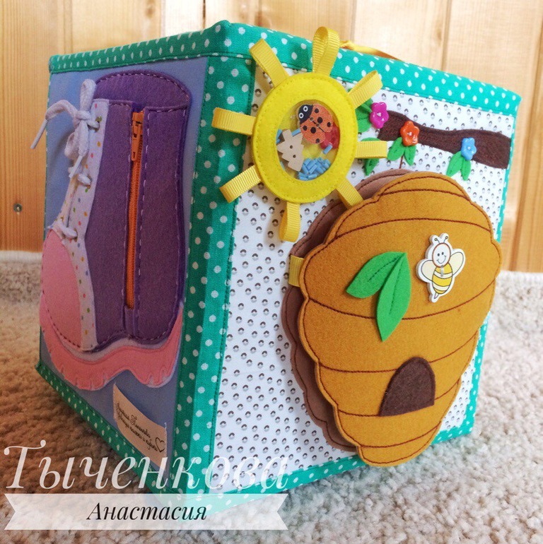 Развивающие игрушкиСшила и уже отправила следующий развивающий кубик. Размеры его 20*20 см. Под cut больше 5 фото.Очень много съемных и развивающих элементов.