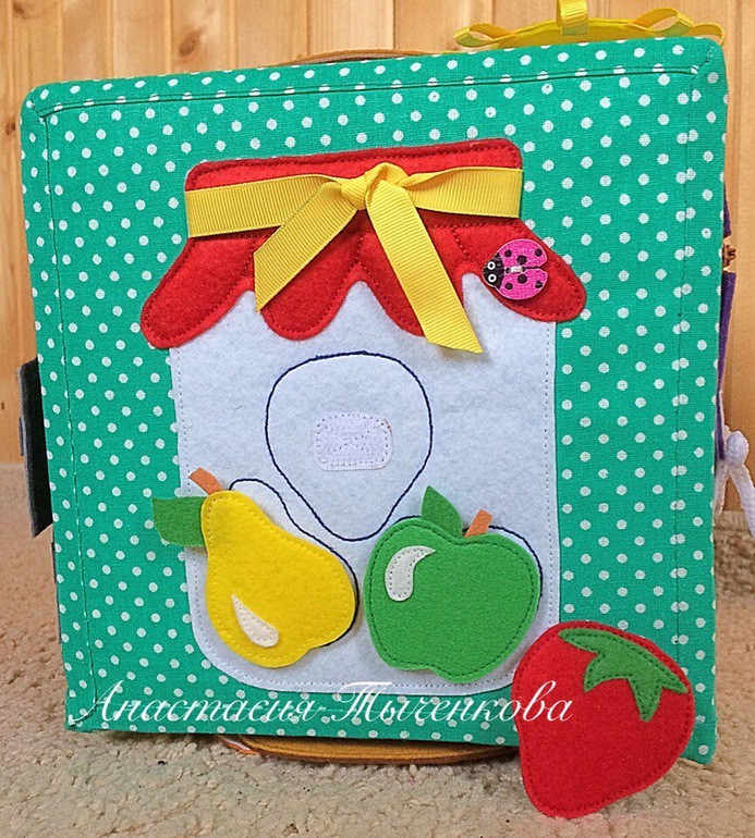 Здесь любимые застёжки используем. Ведь дети так любят прикреплять и отрывать липучки. В процессе игры находим силуэты фруктов и изучаем их названия. А сверху баночки у нас завязки, чтобы малыш учился завязывать и развязывать узелки.