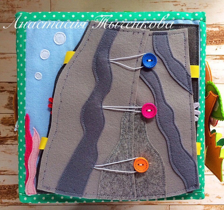 В ней спрятались мама-осьминог и восемь малышей. Их можно сортировать по цветам, крепить на маму на липучки, а можно весить на крючки. Сама пещера на пуговках, поэтому не так-то просто попасть в пещеру, если не умеешь застегивать пуговки.