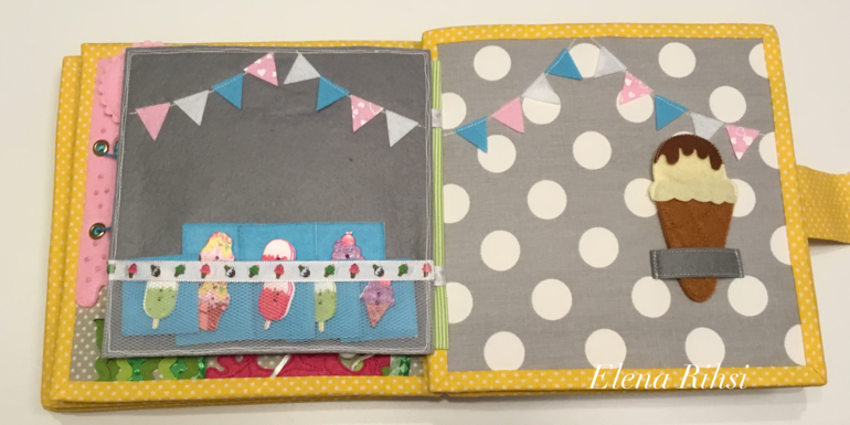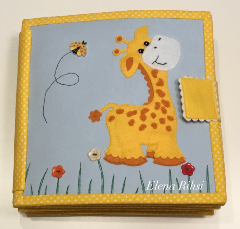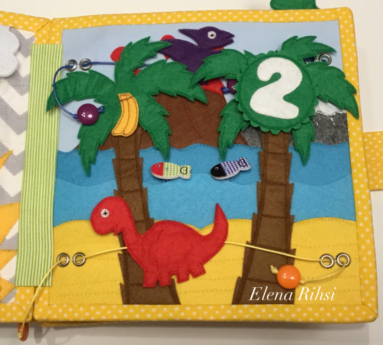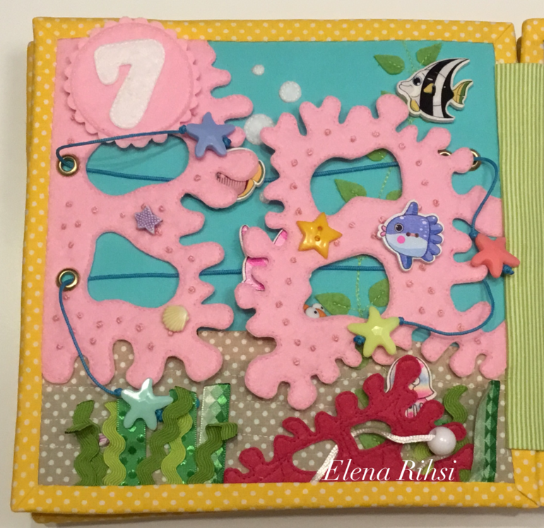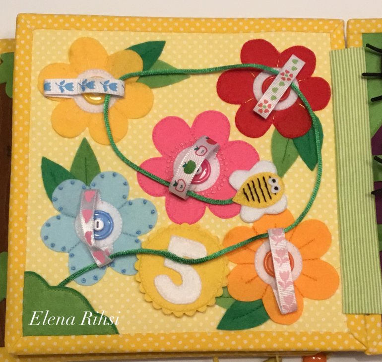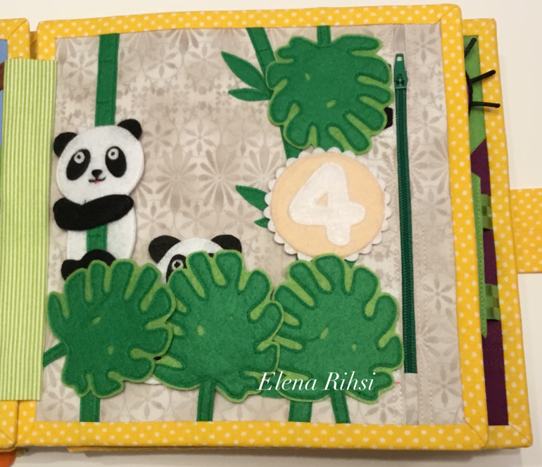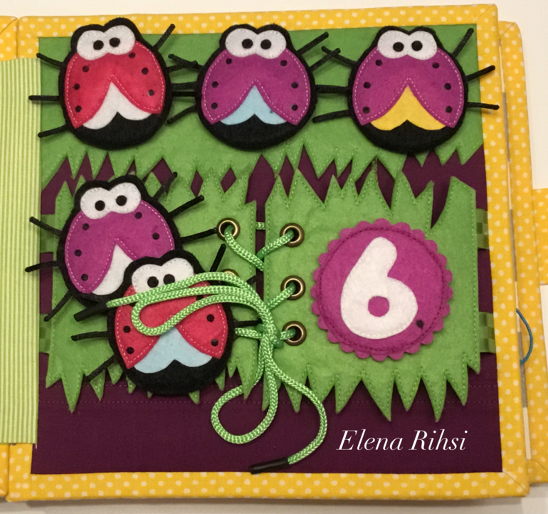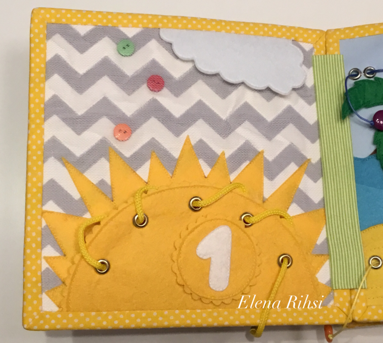 Размер страничек 20*20 ,5 разворотов, закрывается на магнитную кнопку. На заднем кармане вместительный карман. В книжке представлены различные виды застёжек, есть перетяжки, шнуровки, которые очень любят малыши.