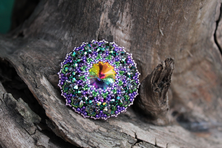 Кристалл радужный гипнотизирует) а фиолетовый и зеленый его очень здорово оттеняют! С узором на павльиньих перьях у меня ассоциация.