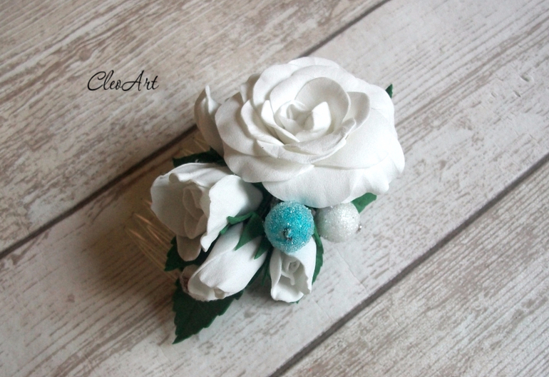 Цветы из ткани и форма. Канзаши. Украшения для волос.Композиция в бело- голубых тонах из розы, бутонов и сахарных ягодок. Станет прекрасным дополнением к новогоднему или свадебному образу. Основа украшения - прозрачный пластиковый гребень.